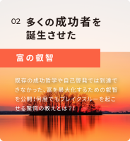 02 多くの成功者を 誕生させた 富の叡智 既存の成功哲学や自己啓発では到達で きなかった、富を最大化するための叡智 を公開!何度でもブレイクスルーを起こ せる驚愕の教えとは?!