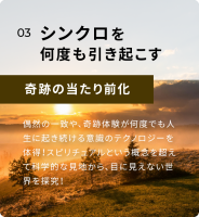 03 シンクロを 何度も引き起こす 奇跡の当たり前化 偶然の一致や、奇跡体験が何度でも人 生に起き続ける意識のテクノロジーを 体得!スピリチュアルという概念を超え て科学的な見地から、目に見えない世 界を探究!