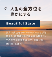 01 人生の全方位を 豊かにする Beautiful State 世界の成功者やTOPリーダーたちが注 目する、最高峰にして最先端の教え!人 生の全てに影響を及ぼす「意識状態( state)」とは?!